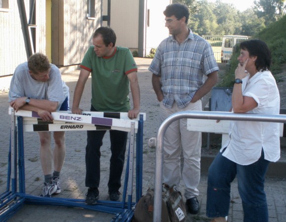 Die guten Geister im Kreis: Hochsprung-Ass Stefan Schmieder, Coach Jürgen Schmider, Kugelstoßer Hubert Schmieder und Flos Mama